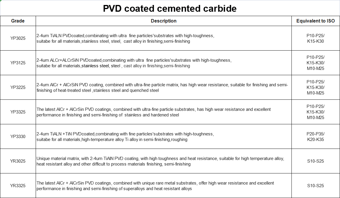 YP3025 | 2-4um TiALN PVD涂層,與超細顆粒基體結合,具有高韌性,適合所有材料,不銹鋼、鋼、鑄造合金精加工、半精加工 | P10-P25 K15-K30 |