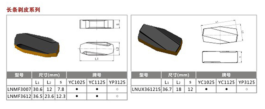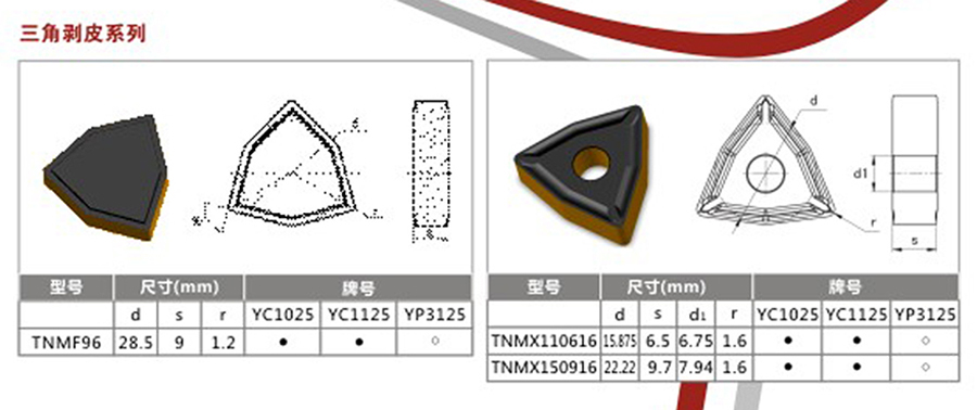 YC1025 | MT-CVD涂層,切削刃結合TiCN+Al2O3(厚)+TiN多層涂層,韌性好,適用于鋼材的半精加工。 | P10~P25 |